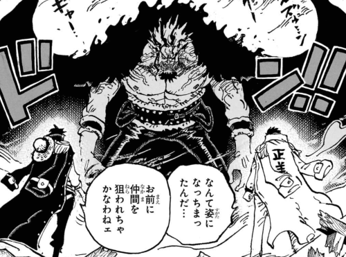 とまどうカイドウとリンリンをぶっ飛ばし、悪魔化して身体がひと回り大きくなり膂力も開放されたロックスに、互角の立ち回りを見せたのはニューゲート。