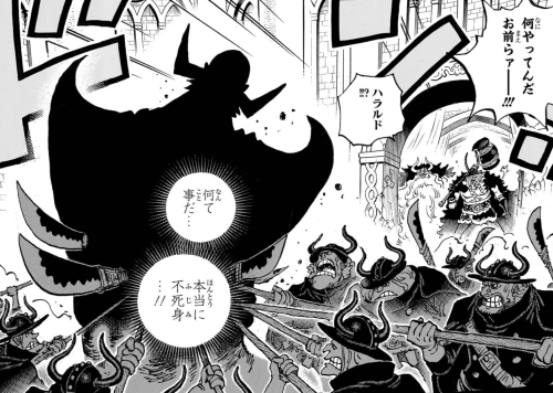 そこへ、ただならぬ覇気を察知して駆けつけたギャバンとシャンクスがハラルドを制止する。