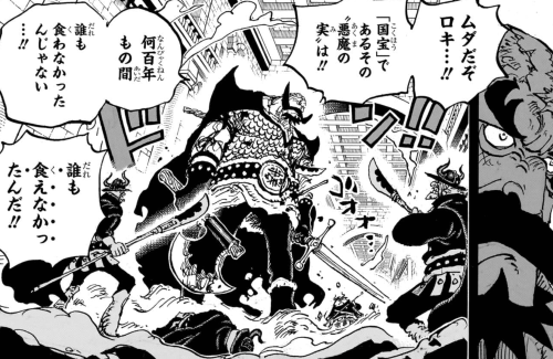 すると、恐ろしい咆哮を上げ巨大な生物の姿に変化するロキ。どうやら「禁断の悪魔の実」も動物系悪魔の実、それもおそらく幻獣種だったと思われ、