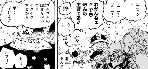 冥界へと真っ逆さまに落ちたコロンたち、しかし彼らが死ぬことはなかった。親たちの中にはかなり深手を負った者もいそうだが、彼らは今まさに陽界を目指して上昇中だったロキとルフィによって受け止められたのだ。